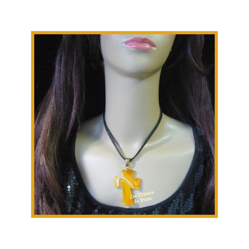 Beau pendentif en agate naturelle en forme de croix de différentes nuances de jaune.