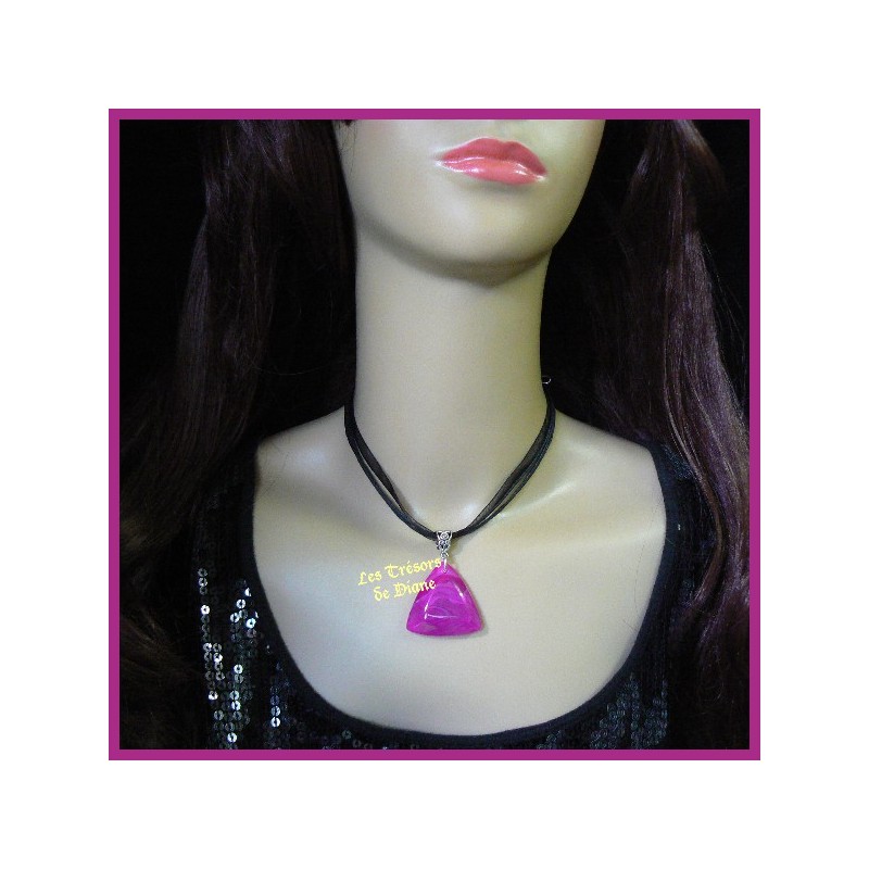 Ravissant pendentif composé d'une agate fuschia de différentes nuances de rose. La couleur de la pierre a été sensiblement accentuée, ce qui n'altère en rien les vertues de l'agate.