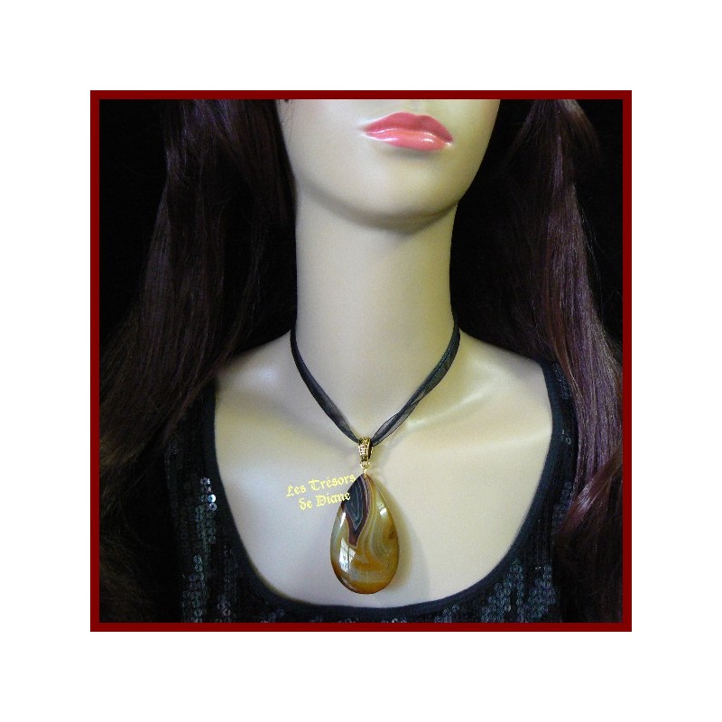 Grand pendentif très chic en agate naturelle en forme de goutte aux doux tons ocre et chocolat.