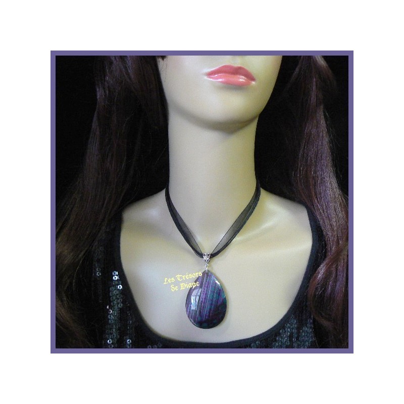 Très beau pendentif en agate en forme de large larme, de différentes nuances de violet, mauve grisé sur fond vert profond.
