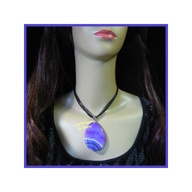Beau pendentif en forme de large large larme, légèrement irrégulière, en agate de différentes nuances de violet.