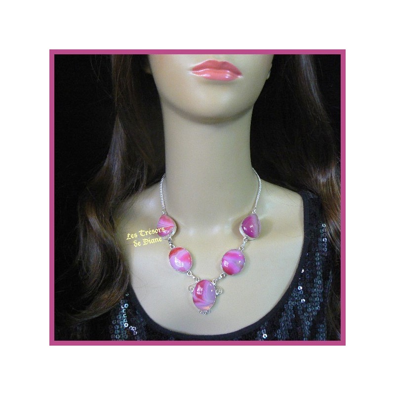 Ravissant collier composé de 5 cabochons de formes diverses en agate rosée.