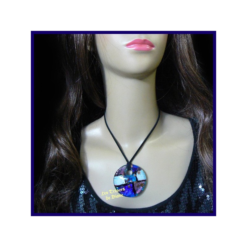 Magnifique pendentif rond en verre conçu selon le savoir-faire Murano et accompagné d'un tour de cou noir en suédine.