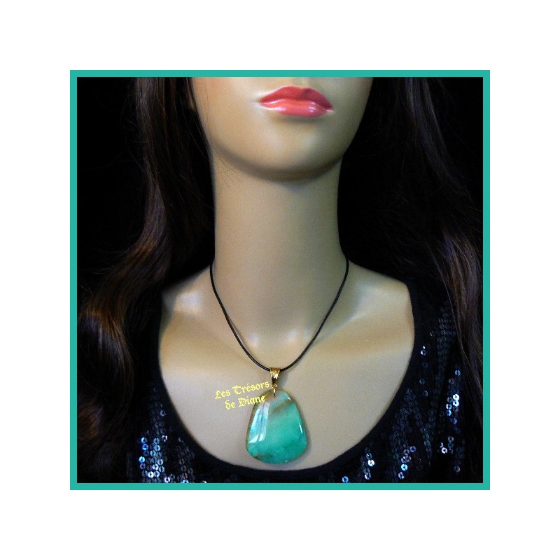 Très beau pendentif composé d'une agate de différentes nuances de vert subtilement striée d'ocre.