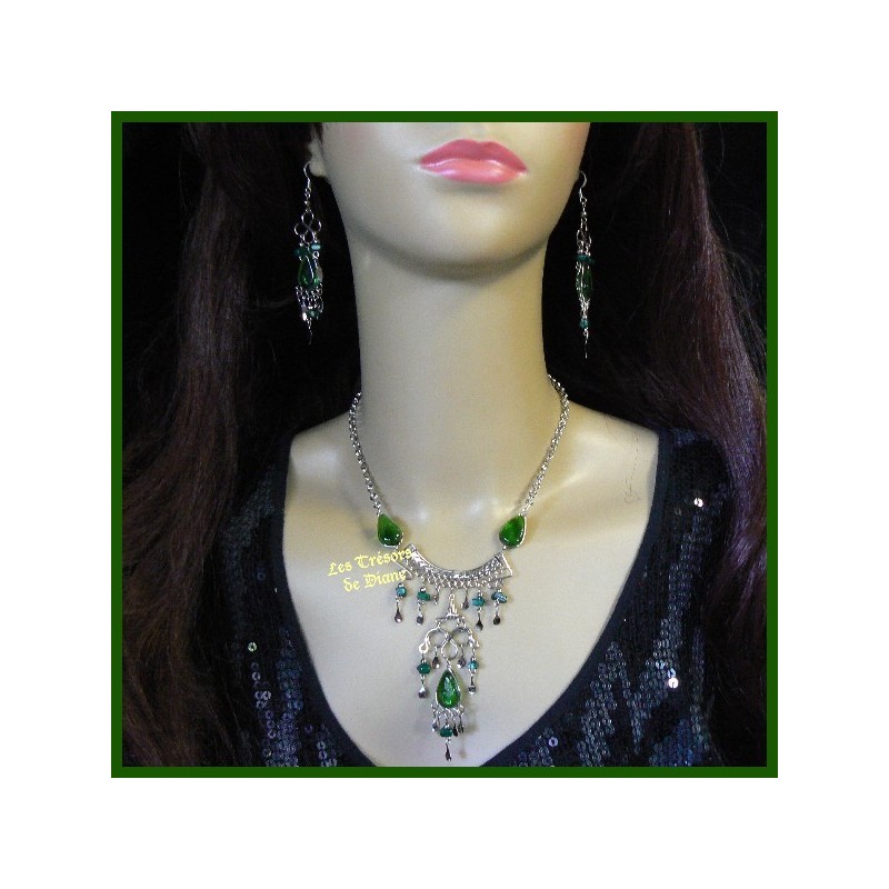 Belle parure composée d'un collier et d'une paire de boucles d'oreilles élaborée par les meilleurs artisans du Pérou, d'une grande finesse, en verre vert, agrémenté de nacre teintée vert.